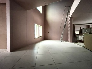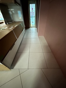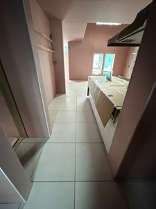 1階の進捗状況は現在、床タイル貼り仕上げ作業です。