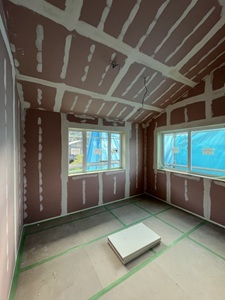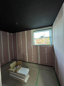 屋内は室内ごとの石膏ボード張りを進めています。
