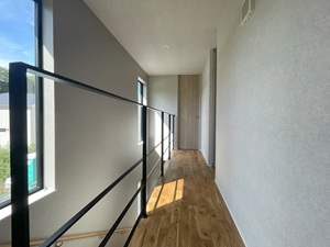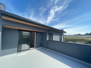 ペット(犬)と暮らすご家族で1階にはウッドデッキを2階には広々バルコニーを設けて、室内外の全体が繋がるようなバリアフリー化しているのが特徴です。1階ウッドデッキはLDKや廊下、個室からも出入りできる配置設定で繋げています。ペットにも心地良い環境づくりです。