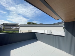 屋内は石膏ボード張りが終了しています。こちらの下地、石膏ボードはハイクリーンボードといって化学物質を分解する作用があるということです。キッチンセットなど機器類も設置されました。屋外は屋根工事が終了して太陽光発電システムを搭載しています。広いバルコニーが印象的な外観ですが、外壁も雑工事を残して仕上がり待ちとなりました。