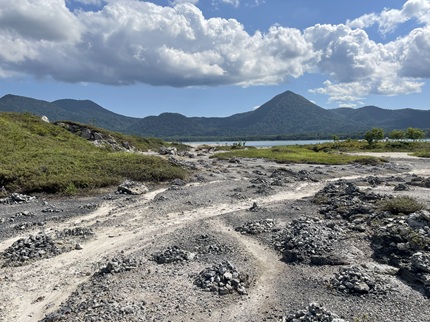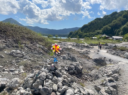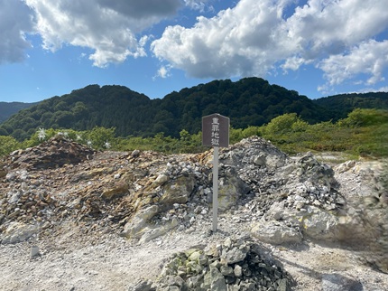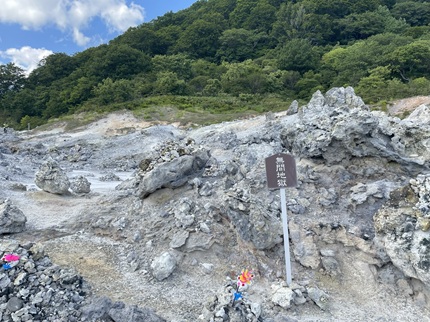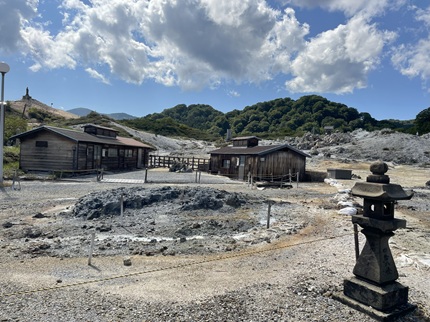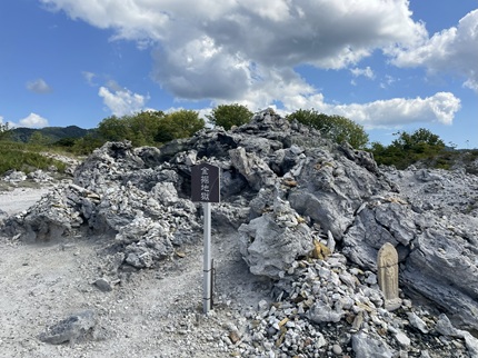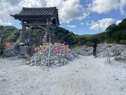 硫黄臭が漂う地獄谷や賽の河原にある石積みや風車、