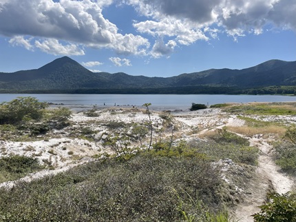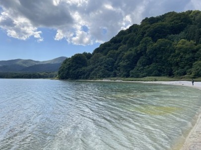 白い砂浜と透明度の高い宇曽利湖畔付近の静寂で清々しい景観が「極楽」。